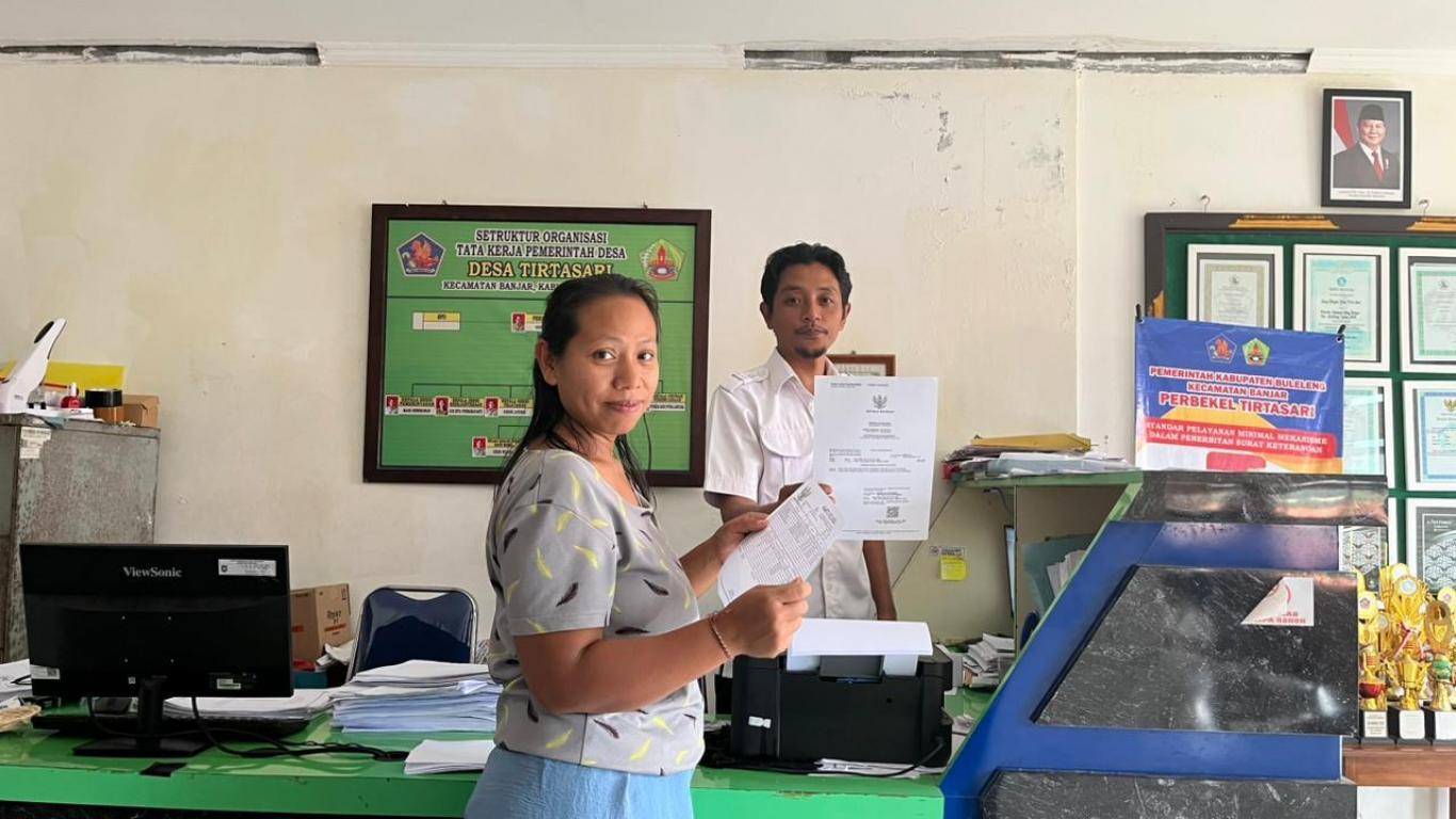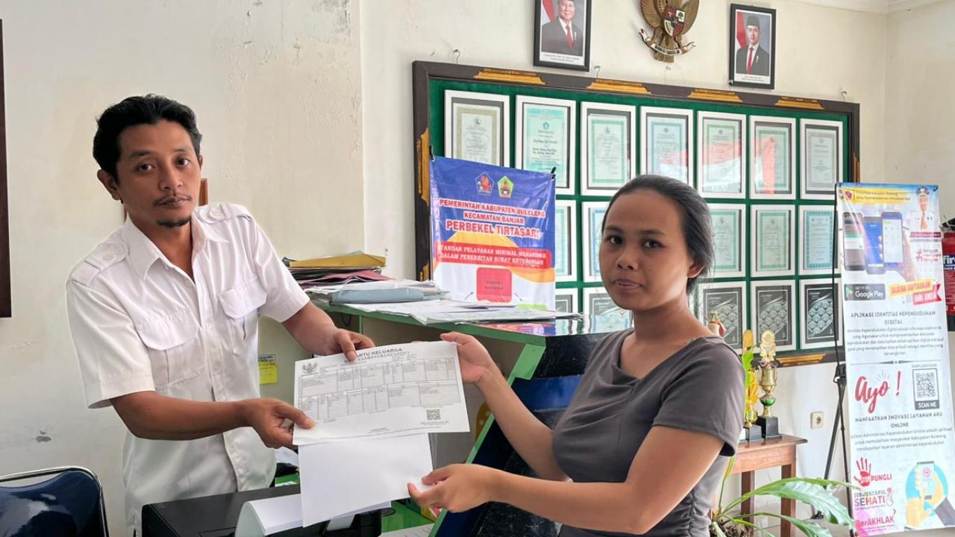 Bertempat dikantor pemerinatah desa tirtasari, Kasi pemerintahan menyerahkan dokumen berupa KK dan Akta Kelahiran Kepada Luh Suarning dan Ariada. Dengan adanya loket disdukcapil didesa dapat mempermudah warga masyarakat untuk memperoleh pelayanan diaplikasi aku online.