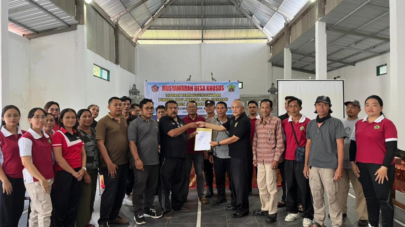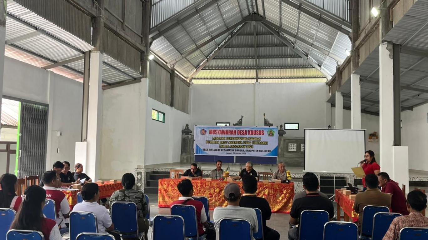 Telah dilaksanakan kegiatan Musyawarah Desa Khusus Penundaan Laporan Pertanggngjawaban Bumdesa " Sadu Amertha " Desa Tirtasari (13/3 ) Tahun Anggaran 2025 yang bertempat di Gedung Balai Masyarakat. Kegiatan ini dihadiri oleh Perbekel beserta perangkat, Ketua BPD beserta Anggota, Bhabinkamtbmas, Bapak Camat Banjar yang diwakili oleh Staf pemerintahan Nyoman Merta Sedana, dan berbagai unsur yang ada didesa. Musyawarah Desa dimaksud dalam rangka penyampian Materi yang dibahas dalam musyawarah desa khusus ini serta yang bertindak selaku unsur Pimpinan Musytawarah dan narasumber adalah : 1. laporan Badan Pengawas Bumdesa terkait LPJ Bumdesa TA 2025, 2. Penyampaian LPJ BUMDesa Tahun Anggaran 2025 oleh Direktur BUMDEsa.